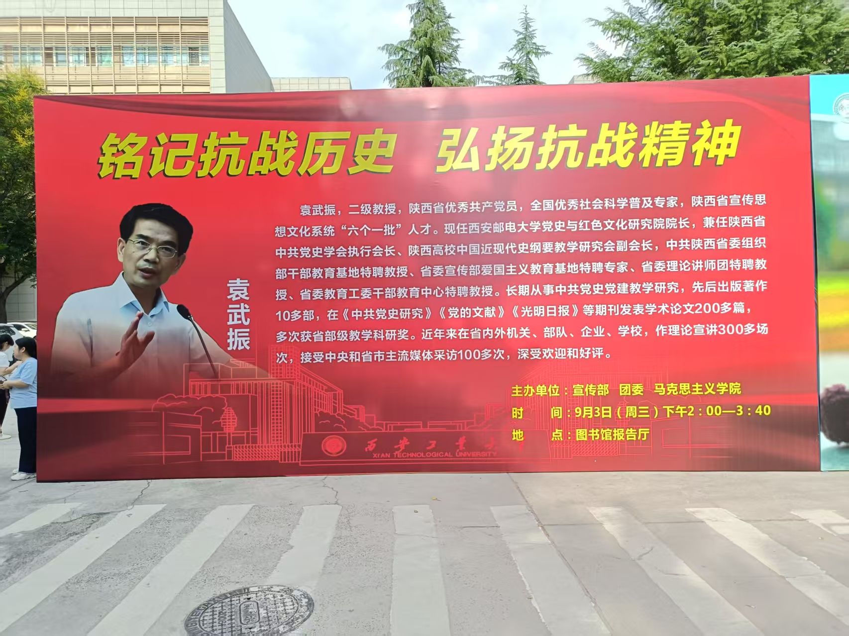 袁武振以“铭记抗战历史 弘扬抗战精神”为主题,从对抗日战争的总体认识、陕西对抗日战争的重要贡献等方面,讲述了中国人民抗日战争的基本历史脉络、陕西军民的抗战贡献,并阐释了抗战精神的丰富内涵及时代价值。袁武振号召同学们从抗战历史和抗战精神中汲取智慧和力量,将伟大抗战精神转化为实现强国伟业、复兴大业的强大动力。
