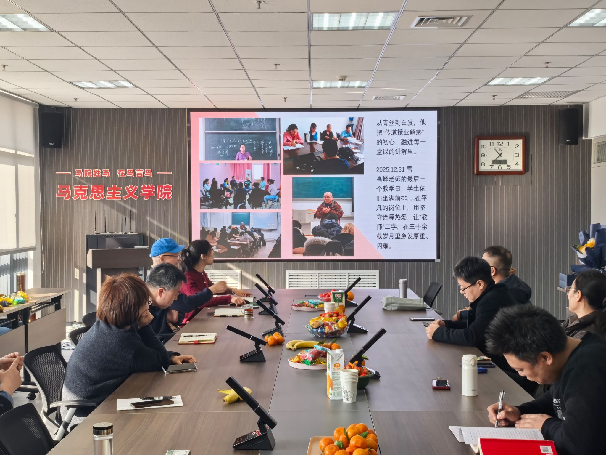 座谈交流环节暖意融融,教师代表纷纷发言,追忆与高老师共事的难忘时光。他是同事眼中的良师益友,谦逊低调、友善真诚,以其特有的教学方法,使思政课兼具思想深度与课堂温度;是学生眼中最喜爱的老师,关怀备至、循循善诱,悉心疏导学生困惑,关心学生成长,阐释师者的仁厚与担当。
