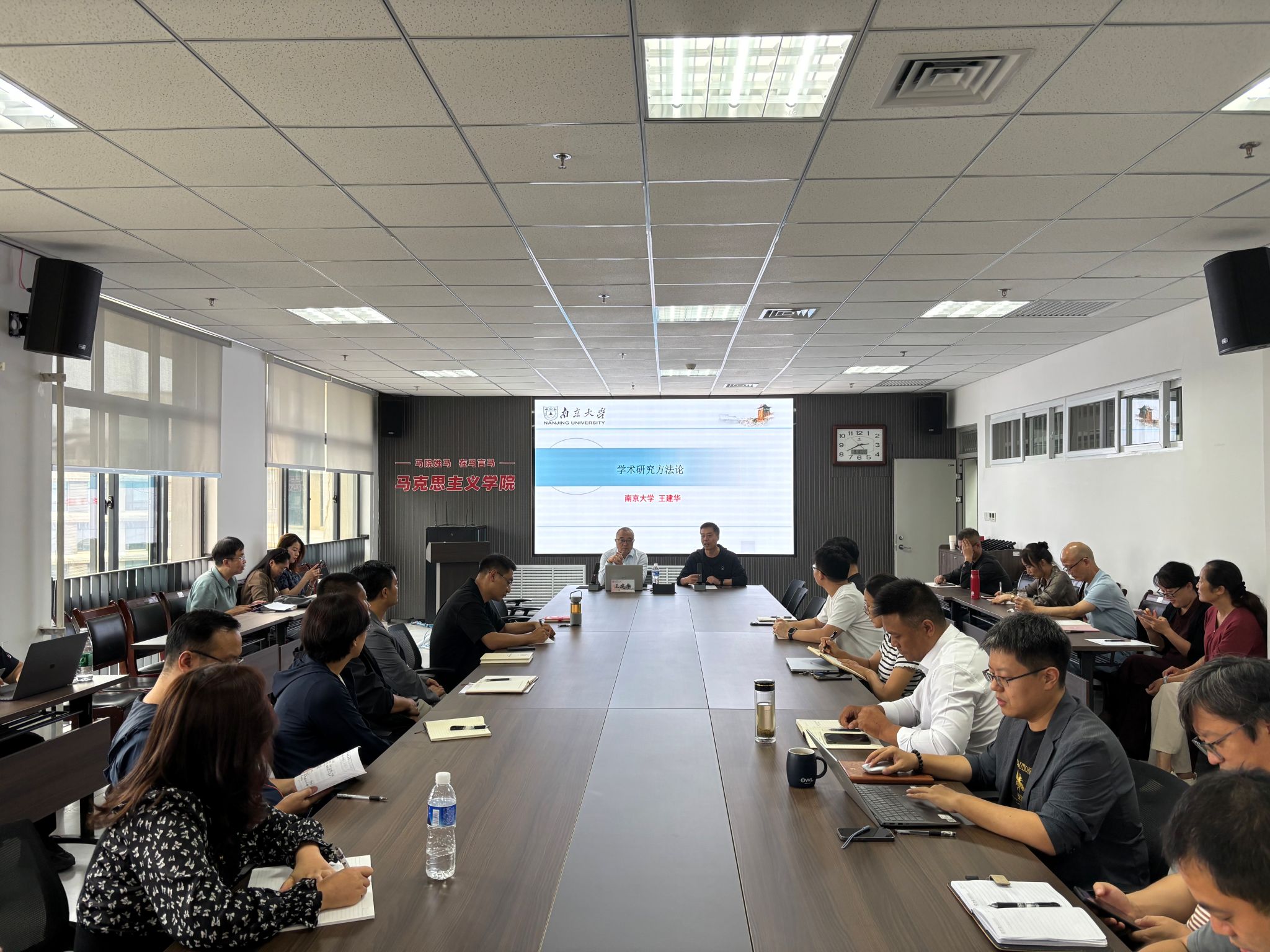 王建华教授旁征博引,结合自身丰富的学术研究经验,首先以中共党史研究为例,提出学术研究需要坚持“从常识出发”;随后,结合马恩经典著作中关于“统一战线”的表述,强调学术研究一定要“坚持问题导向”,引导师生思考如何从经典文献与历史实践中提炼问题;最后从马克思主义唯物史观、矛盾分析法、阶级分析方法、系统分析法、文献分析法、实证分析法六个方面,详细讲解了马克思主义思想方法论,引导师生打好学术研究方法论的坚实基础。
